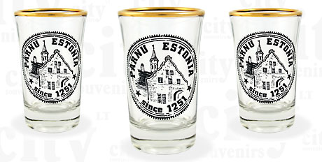 Suvenyras – stikliukas 40ml. Parnu. Stikliuko aukštis 70mm, skersmuo 43-35mm. Stikliukas dekoruotas auksu.