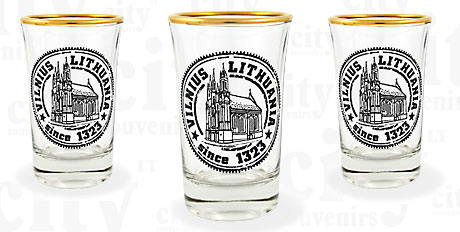 Suvenyras – stikliukas 40ml. Vilnius, Onos bažnyčia. Stikliuko aukštis 70mm, skersmuo 43-35mm. Stikliukas dekoruotas auksu.