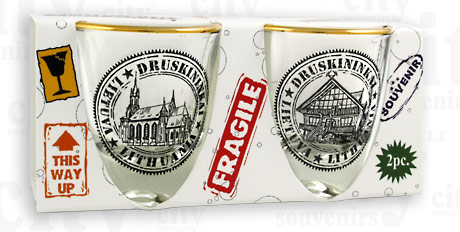 Suvenyras – stiklinės taurelės Druskininkai. Taurelės dekoruotos auksu. Taurelės aukštis 5,0 cm