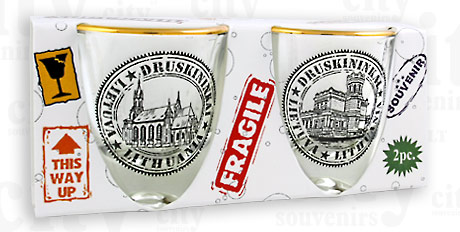 Suvenyras – stiklinės taurelės Druskininkai. Taurelės dekoruotos auksu. Taurelės aukštis 5,0 cm