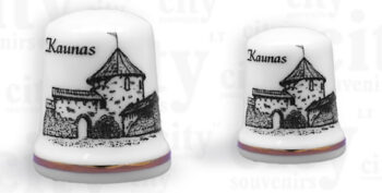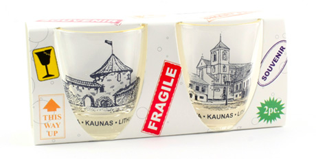 Suvenyras – stiklinės taurelės su Kauno pilies ir Arkikatedros atvaizdu. Taurelės dekoruotos auksu.