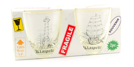 Suvenyras – stiklinės taurelės su Klaipėdos švyturio ir Meridiano atvaizdu. Taurelės dekoruotos auksu.