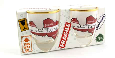 Suvenyras – stiklinės taurelės Latvia. Taurelės dekoruotos auksu.