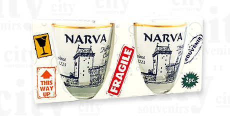 Dviejų taurelių komplektas. Suvenyras – stiklinės taurelės Narva. Taurelės dekoruotos auksu. Taurelių aukštis 5,0 cm