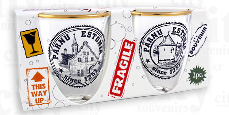 Dviejų taurelių komplektas. Suvenyras – stiklinės taurelės Parnu. Taurelės dekoruotos auksu. Taurelių aukštis 5,0 cm
