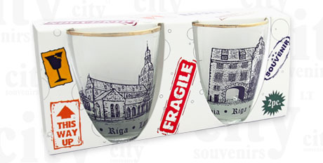 Suvenyras – stiklinės taurelės Ryga. Taurelės dekoruotos auksu.