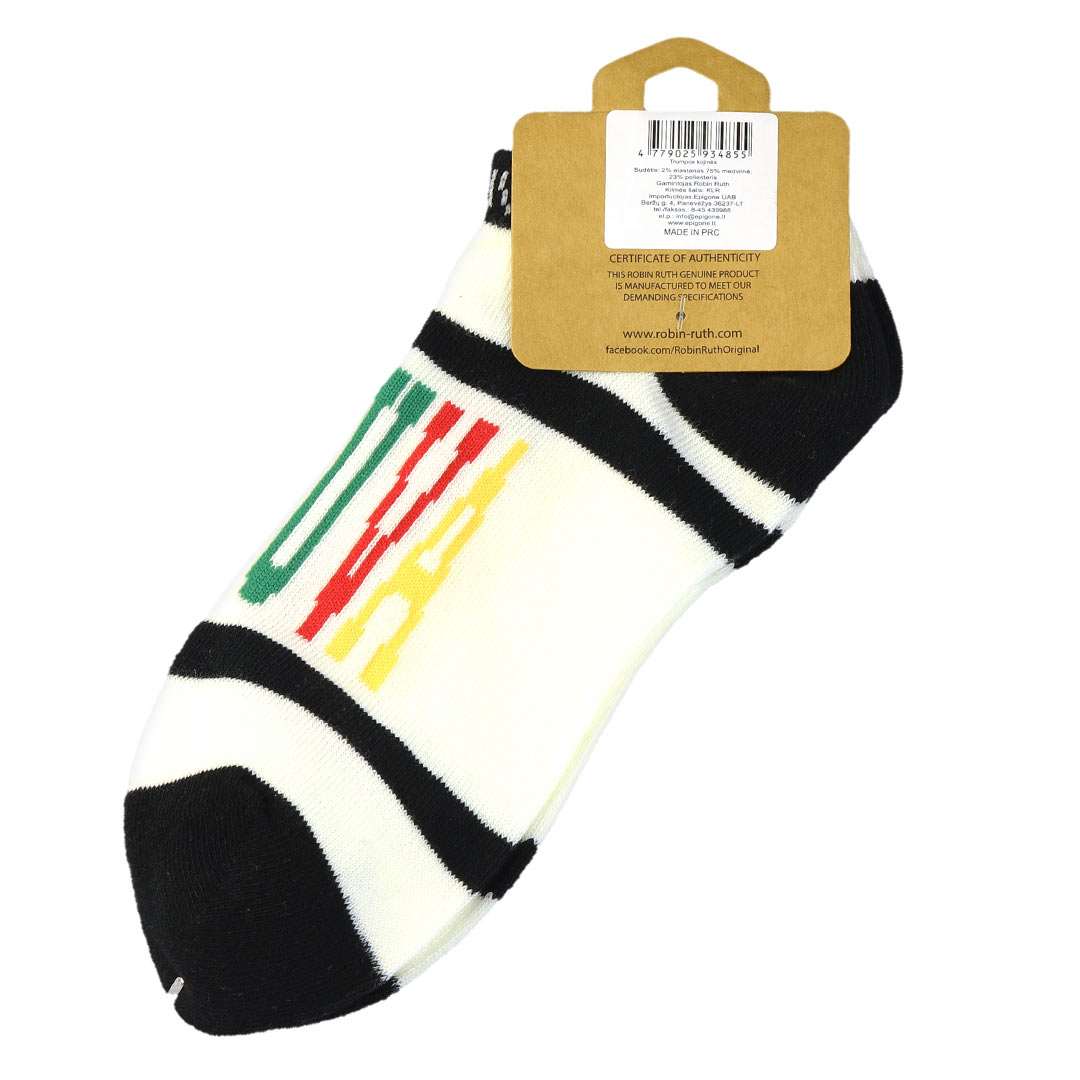 Trumpos vyriškos kojinės su užrašu LIETUVA – modernus ir patrauklus lietuviškos atributikos aksesuaras, puikiai tinkantis kasdieniam nešiojimui ir suvenyrų prekybai. Kojinės pasižymi balta spalva su kontrastingomis juodomis detalėmis ir ryškiu LIETUVA užrašu Lietuvos vėliavos spalvomis – geltona, žalia ir raudona. Minimalistinis dizainas su trispalvės spalvomis sukuria sportišką ir šiuolaikišką stilių. Didelis medvilnės kiekis užtikrina komfortą ir leidžia pėdai kvėpuoti. Poliamidas suteikia patvarumo, o elastanas padeda kojinėms gerai priglusti prie pėdos ir išlaikyti formą. Trumpo modelio kojinės puikiai tinka: