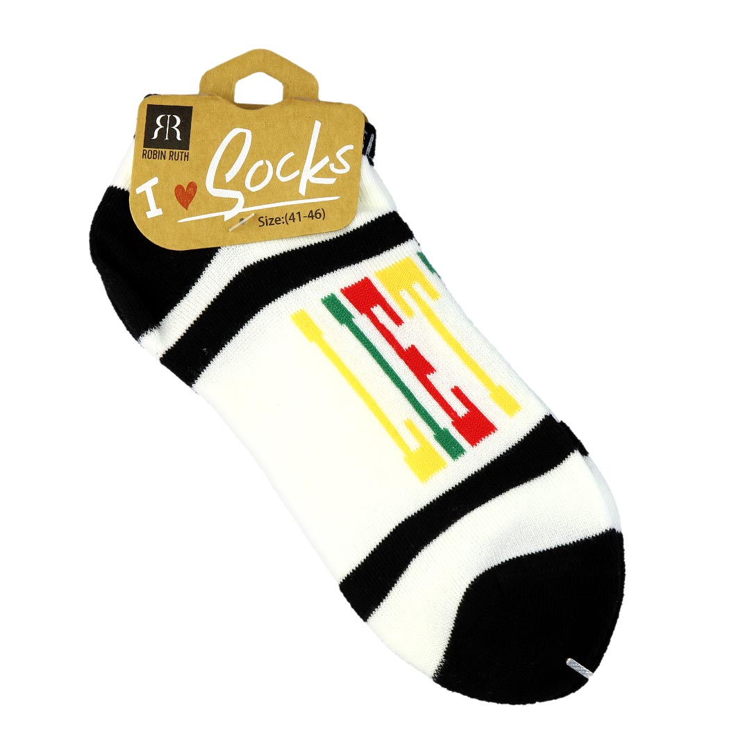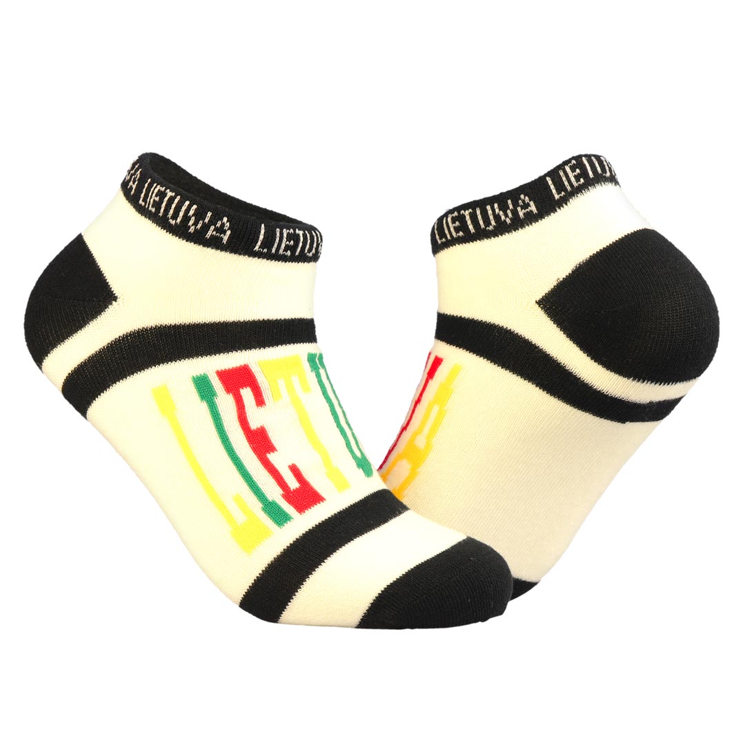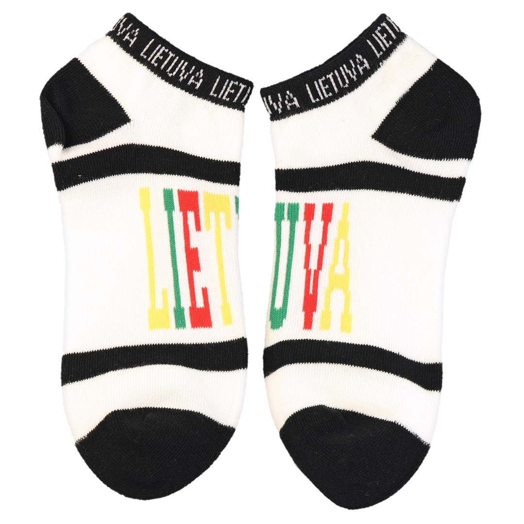 Baltos trumpos vyriškos kojinės su užrašu LIETUVA Lietuvos vėliavos spalvomis. Patogios medvilninės kojinės – stilingas lietuviškos atributikos suvenyras.