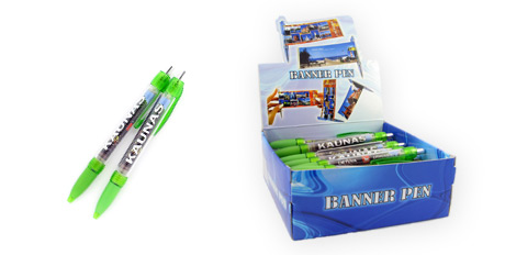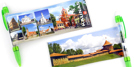 Paveikslėlyje pavaizduoti Kauno miesto vaizdai. Paveikslėlis ištraukiamas patraukus už tušinuko metalinės juostelės, ja paleidus paveikslėlis suvažiuoja atgal. Paveikslėlio ilgis 18cm, plotis 7cm. Tušinukai supakuoti demonstracineje dėžutėje po 50vnt.
