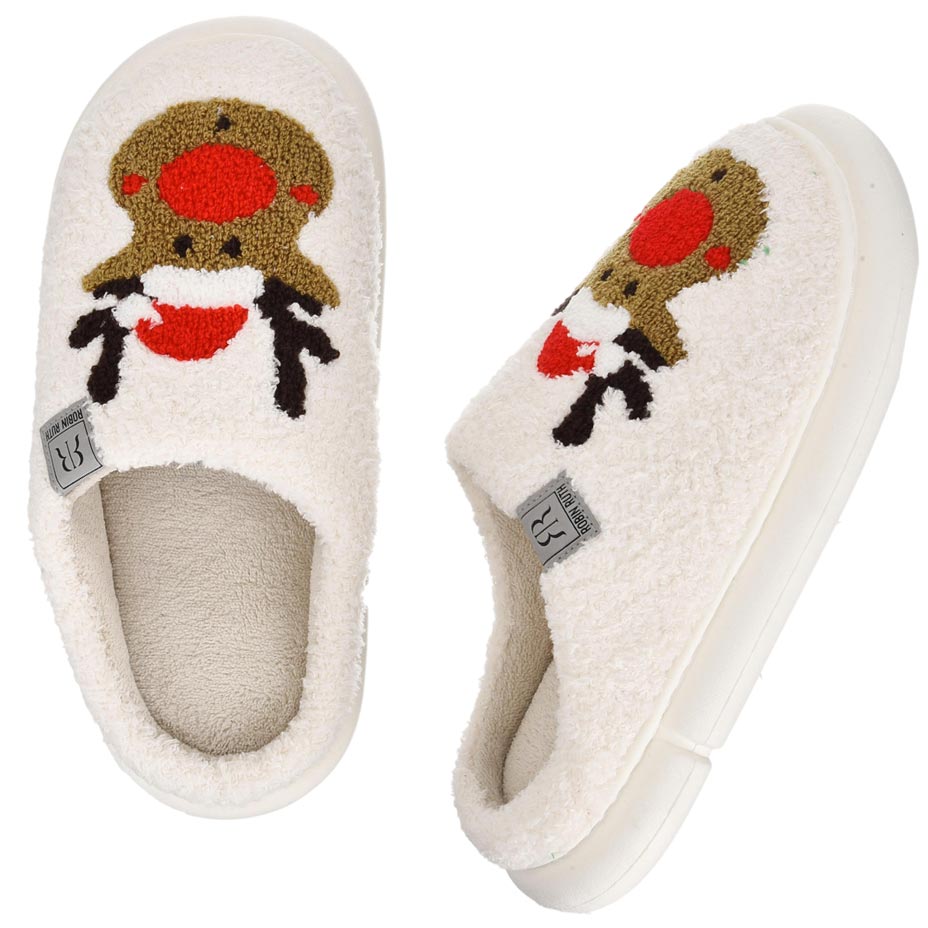 Baltos vyriškos kalėdinės šlepetės su elniu – šiltos, minkštos ir itin patogios namams.