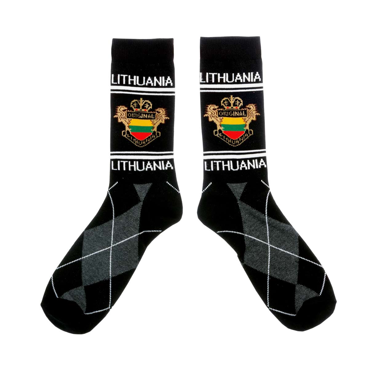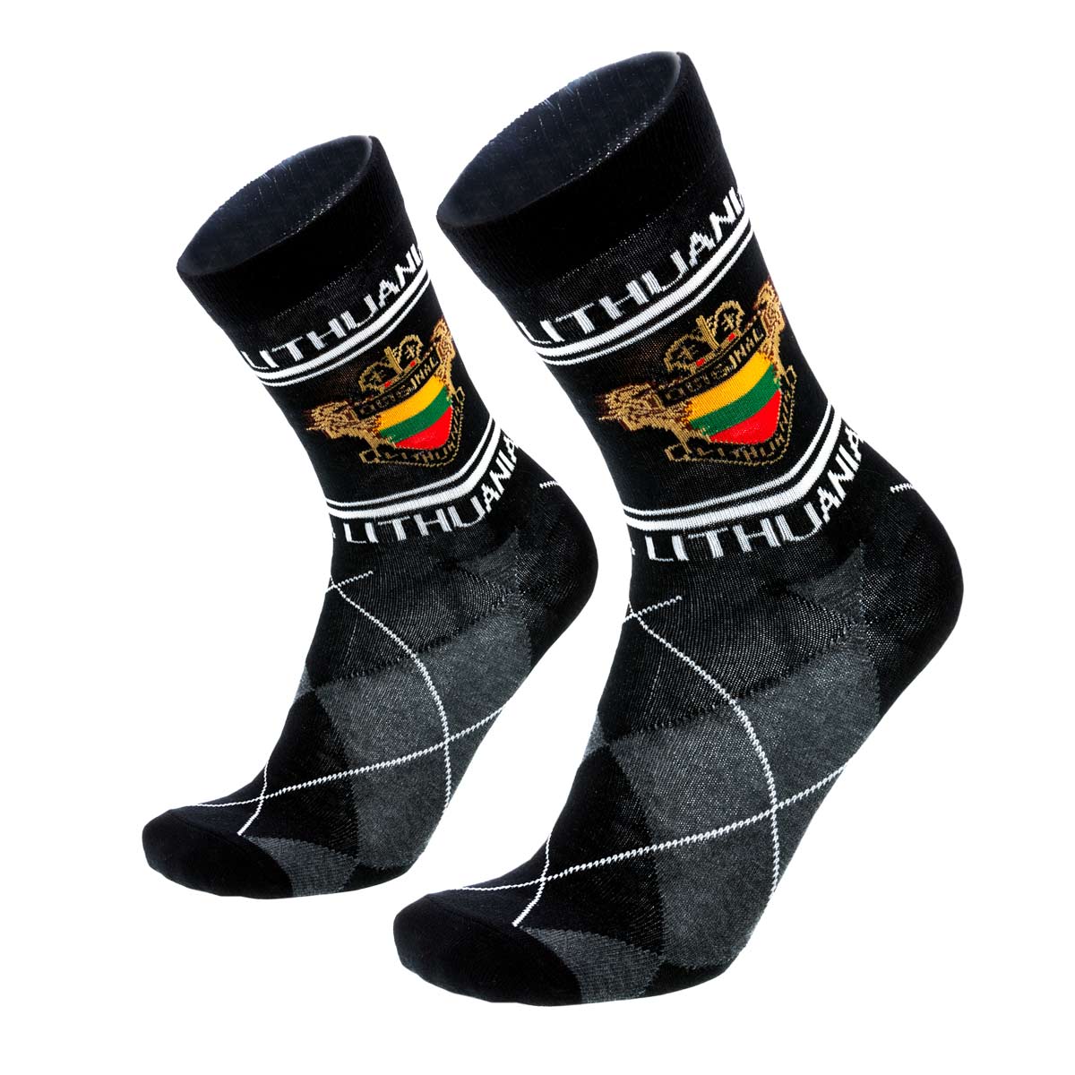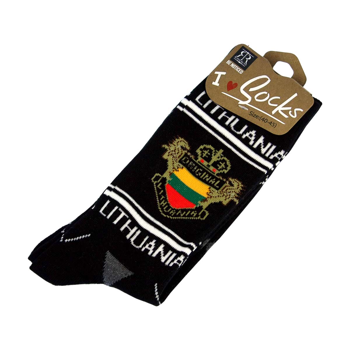 Juodos vyriškos kojinės su užrašu „Lithuania“ ir Lietuvos simbolika. Patogios medvilninės kojinės – populiarus suvenyras iš Lietuvos.