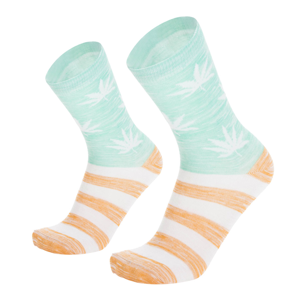 Šviesiai žalios spalvos viršus dekoruotas subtiliais lapų motyvais, o apatinė dalis papildyta kontrastingomis baltos ir oranžinės spalvų juostomis. Toks spalvų derinys suteikia kojinėms gaivumo ir modernumo, todėl jos puikiai dera tiek prie laisvalaikio, tiek prie kasdienės aprangos.