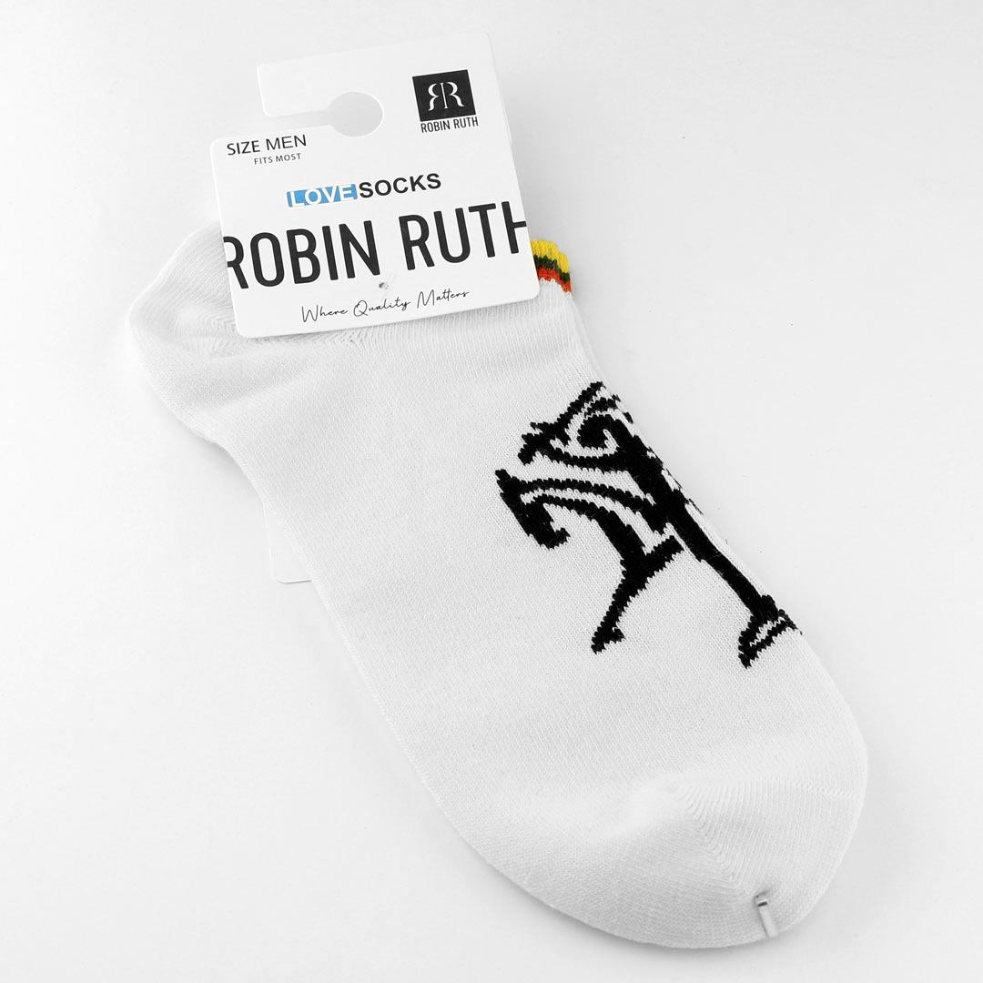 Baltos vyriškos trumpos kojinės „Vytis“ su ryškiu tautiniu akcentu – Vyčio simboliu ir trispalvės spalvomis viršutinėje kraštinėje – tai išskirtinis pasirinkimas vyrams, vertinantiems Lietuvos simboliką ir komfortą.