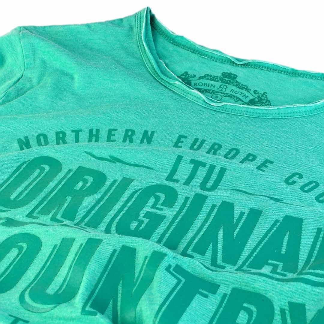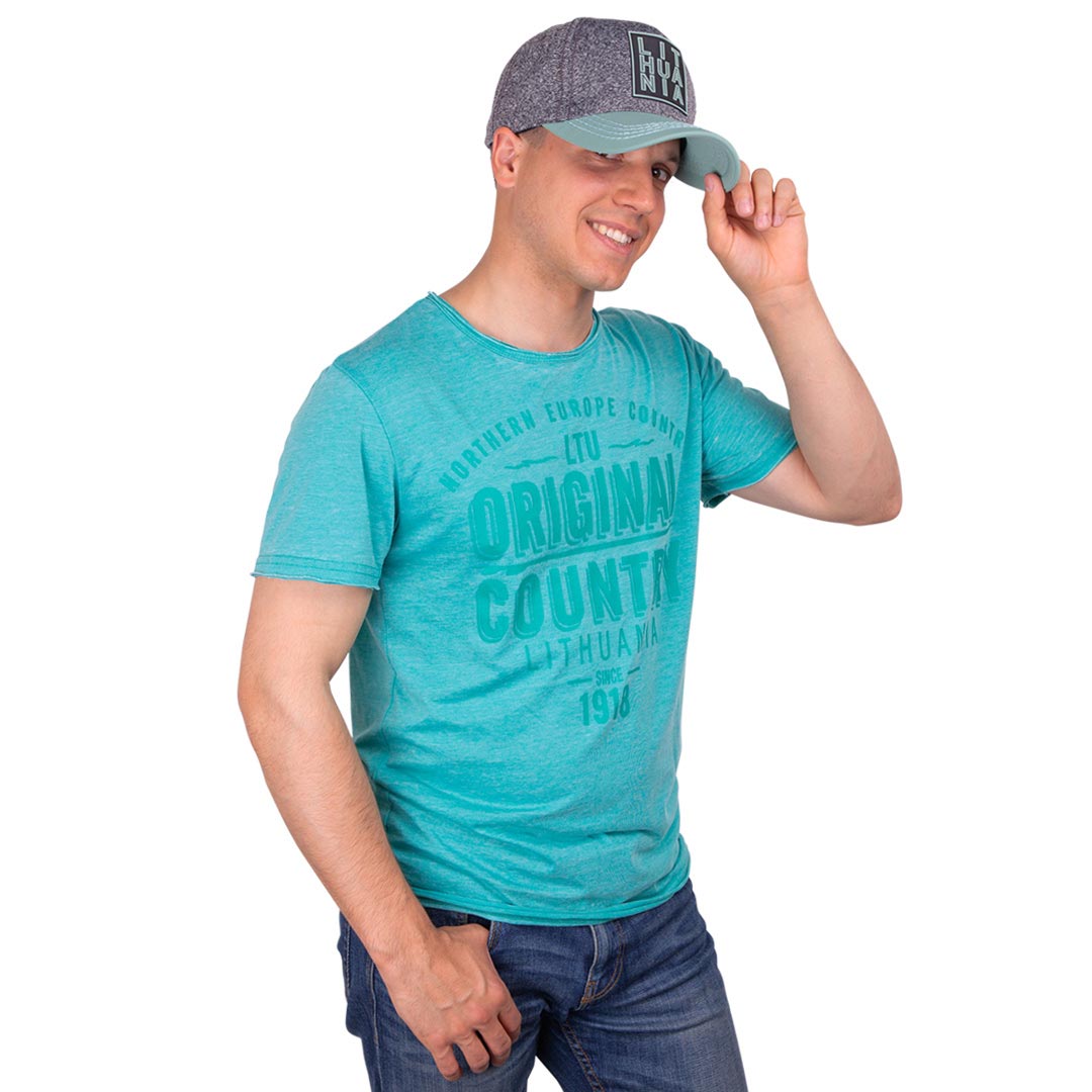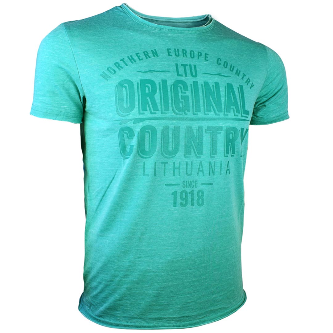 Patogūs žali marškinėliai su užrašu „Original Country Lithuania 1918“. Puikus pasirinkimas kelionėms ir laisvalaikiui.