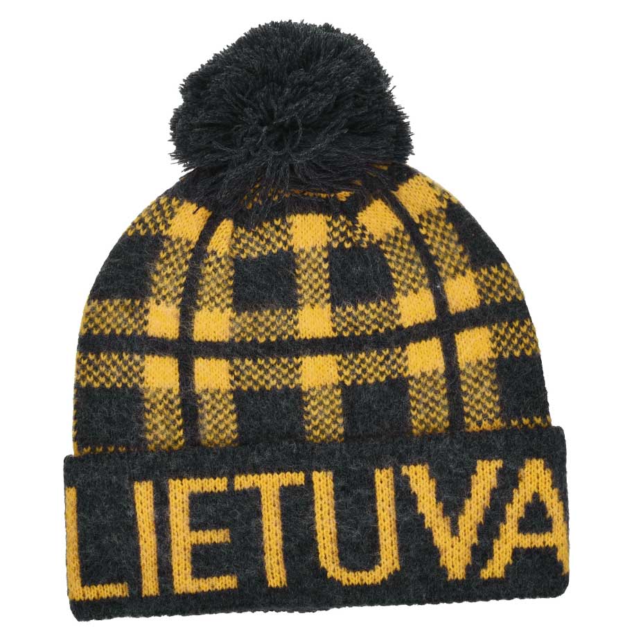 Stilinga ir šilta žieminė kepurė su užrašu LIETUVA, dekoruota kontrastingu juodos ir geltonos spalvų raštu bei papildyta puriu kutu. Šis modelis išsiskiria ryškiu dizainu ir puikiai perteikia lietuvišką identitetą moderniu stiliumi.